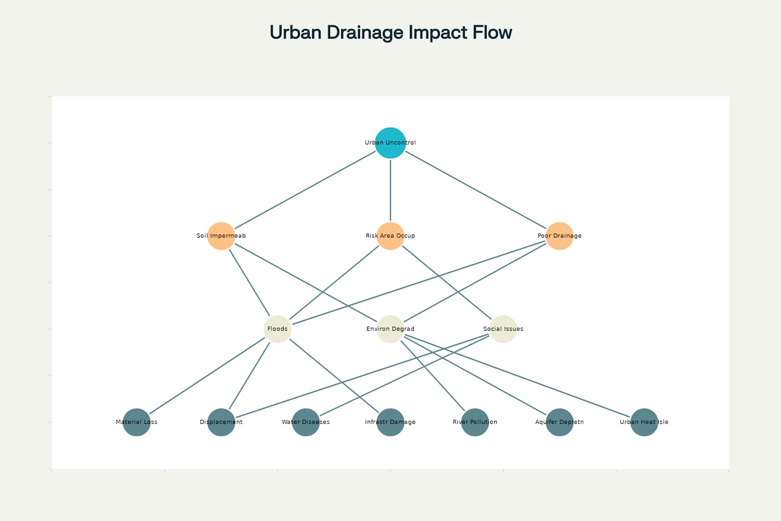 As enchentes urbanas representam eventos que, embora naturais, causam consequências sociais devido a causas humanas6. Os impactos incluem prejuízos materiais como perda de bens, veículos e danos às edificações, além de prejuízos sociais como desalojamento de pessoas, problemas na mobilidade urbana e proliferação de doenças transmitidas pela água6.
